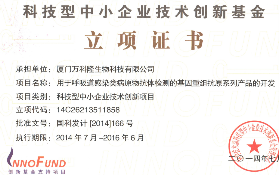 科技型中小企業(yè)技術(shù)創(chuàng)新基金立項(xiàng)證書